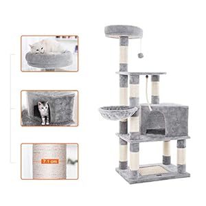 FEANDREA-Katzenbaum-mit-Kratzbaum-Kletterbaum-fr-Katzen-148-cm-hoch-mit-Hhle-und-Liegeflchen-in-HellGrau-PCT60W