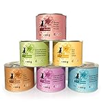 MULTIPACK 1 bestehend aus 6 x 200g Dosen mit den Sorten: N° 3 Geflügel, N° 5 Lachs, N° 7 Kalb, N° 9 Wild, N° 11 Lamm und Kaninchen, N° 13 Hering und Krabben. Garantiert ohne Konservierungsstoffe