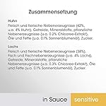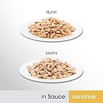 Hochwertige Nährstoffe, die sorgfältig auf die Bedürfnisse von sensiblen Katzen abgestimmt sind, kombiniert mit feinem Lachs in Sauce & Huhn in Sauce ergeben das ideale Katzen Nassfutter
